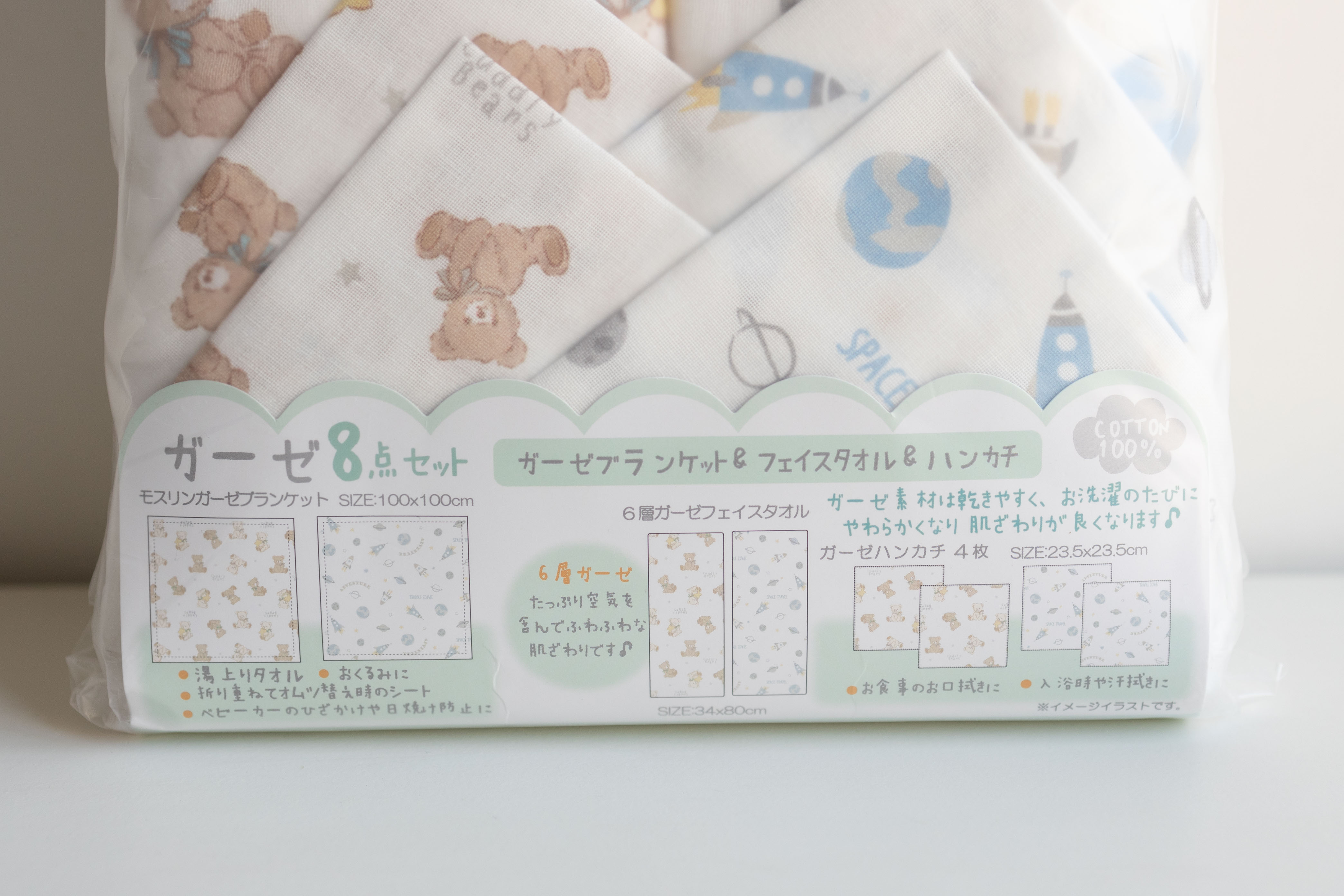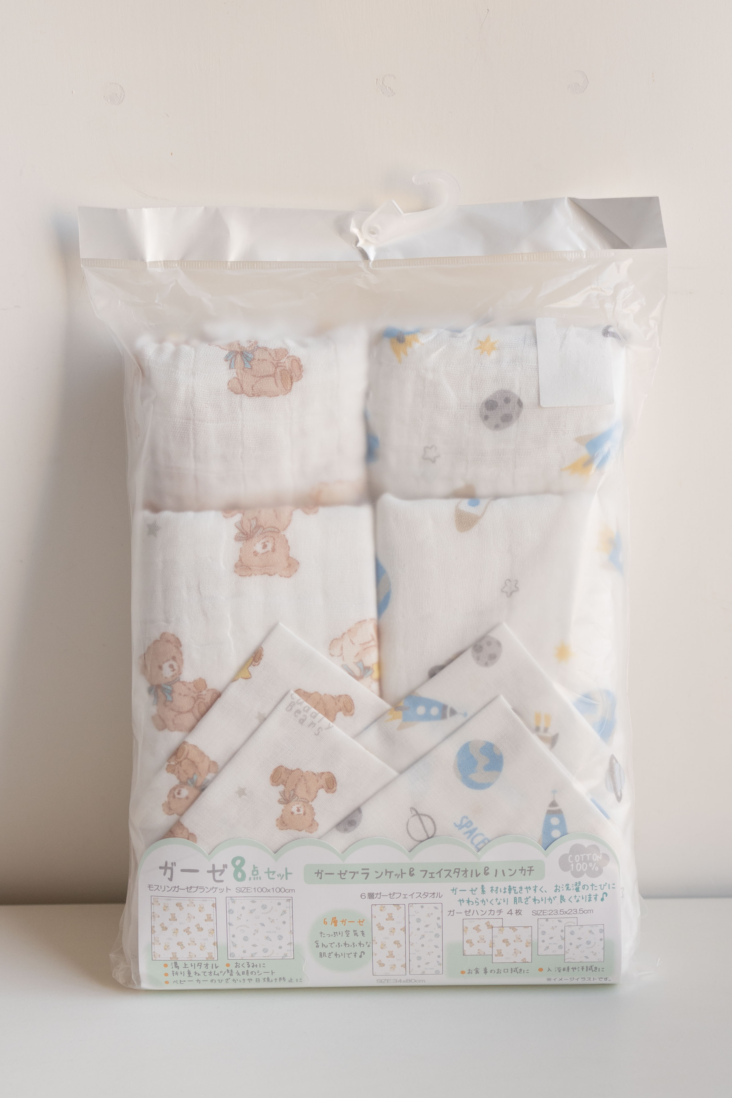 日常紗巾size 23.5cm x 23.5cm x 4條 浴巾size 100cm x 100cm x 2條 六層紗大紗巾size 34cm x 80cm x 2條 Price $ 168